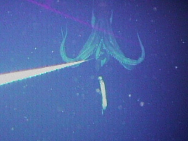 罕见的视频是一只巨大的鱿鱼狩猎猎物,被一个新的摄像头,被动的深海平台捕获,该平台在海洋深处很好,而且也没有吓到深海生物。