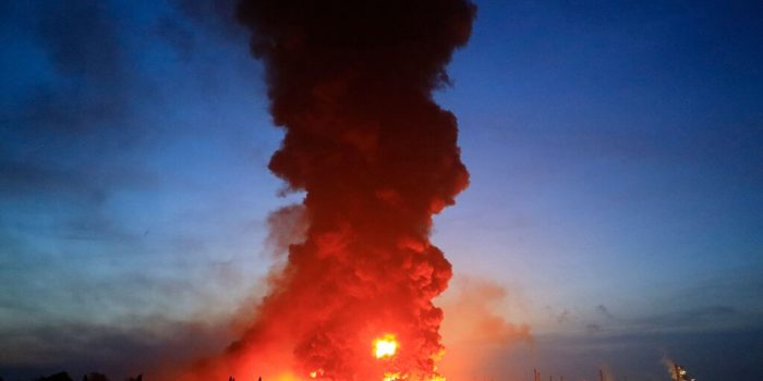 大火始于午夜,白天和白天都燃烧。当局无法估算何时可以完全扑灭大火。拥有炼油厂的公司在一份声明中说:“大火的原因是确定的,但在事件发生时,大雨伴随着闪电”。