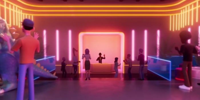 然而,人们的反应并不十分积极。在这段视频中,可以看到几十个虚拟人物站在原地一动不动,而现实世界中的两名电子艺术家则通过一个巨大的虚拟屏幕尽力取悦一动不动的人群。