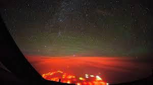 一名飞行员飞越大西洋,注意到他从未见过的奇怪的红色发光。照片显示了无法解释的红灯。它也在视频中也记录在视频中。