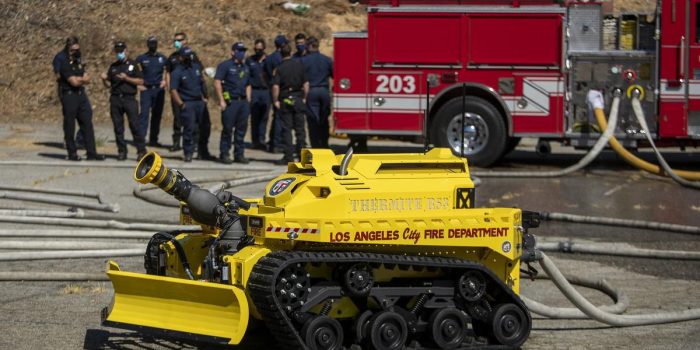 为了实现此类事故的现代解决方案,洛杉矶消防局推出了Thermite RS3。这是一名具有巨大功能的机器人消防员。