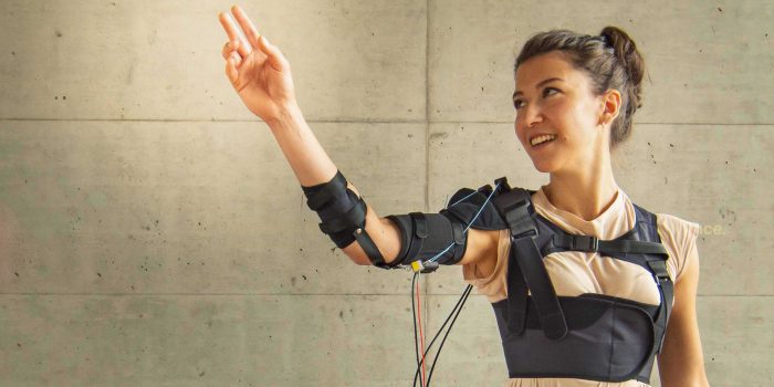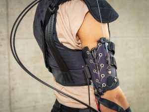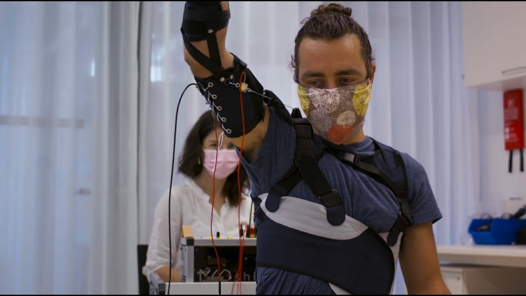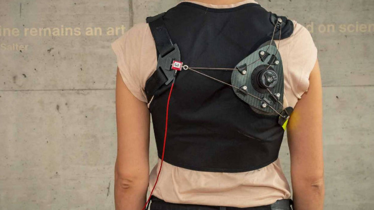 “这是一种带袖口的背心,上臂上有一个小盒子,其中包含所有直接在体内使用的技术。爱游戏ayx体育通过嵌入织物中的传感器工作,智能算法检测到佩戴者的故意运动和所需的力量。然后,电动机在与佩戴者的肌肉平行的织物中缩短电缆(一种人造肌腱),并以这种方式支持所需的运动。“