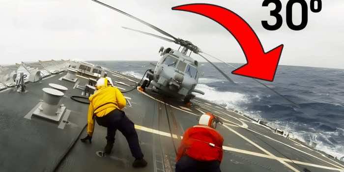 没有什么可担心的,因为现代直升机配备了一种特殊的系统,称为“直升机拖放和快速固定设备(HHRSD)”。该系统涵盖了直升机的滚动最多30度,其9度的球场为6度。这是令人难以置信的,因为这一切都可以在极端天气的条件下降落在颤抖的船上,这似乎是不可能的。该系统也称为“熊束”,因此,在恶劣天气条件下的直升机着陆已经变得无故障。