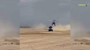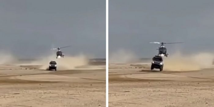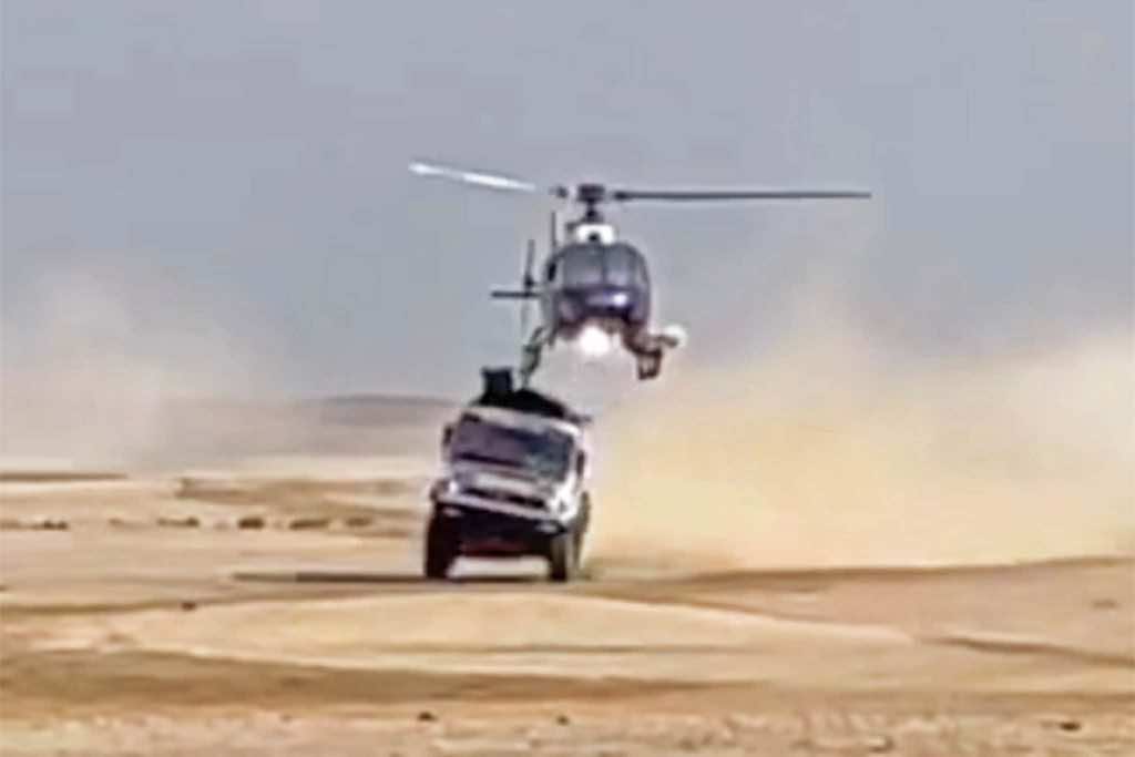 当你看看罕见的事件的镜头时,低悬停的直升机撞到了Shibalov的Kamaz超速卡车的屋顶,当它撞到沙丘后撞到空中时。