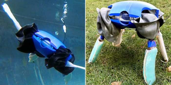 更不用说,机器人有一个惊人的能力,立即把它的四肢变成鳍状肢,考虑不同的参数如刚度、形状等等。需要注意的是,有人造肌肉安装在四肢,使机器人能够调整其肢体结构按照现行环境。例如,如果从土地到水,就立刻改变它的四肢变成鳍状肢,这样就可以轻松地漂浮在水面上。