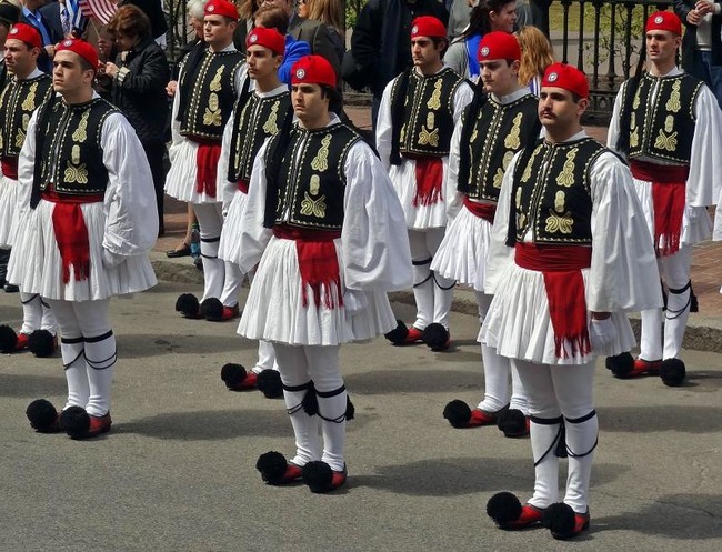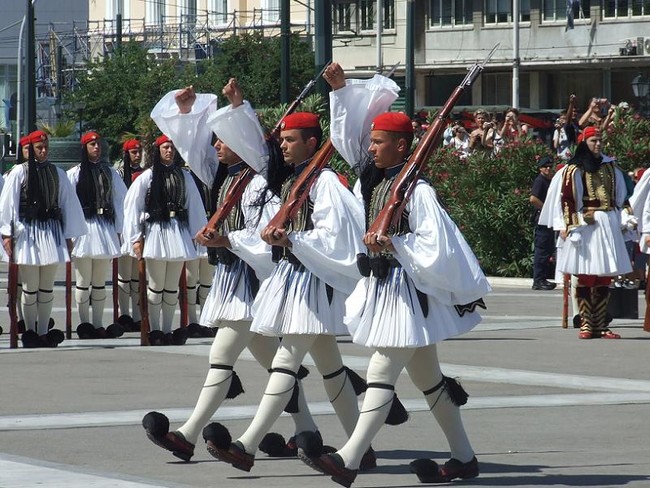 这是精锐部队的制服- - - - - -轻步兵- - - - - -它被赋予了守卫希腊无名战士墓的职责。这个单位被称为Evzones。士兵必须至少有6英尺1英寸的身高才有资格入伍。这条裙子被称为fustanells的方格呢裙,由98英尺的布料折叠成400个褶,每个褶代表土耳其占领的一年。