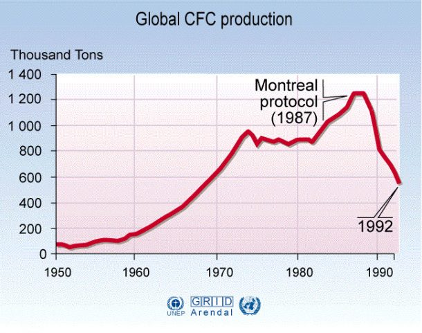 很久以前,一种叫做氯氟烃(CFC)的化学物质就被用于气溶胶罐和冰箱中。没有人意识到它们带来的影响。20世纪70年代,科学家们意识到,被消耗的氟氯化碳会留在环境中,侵蚀保护我们免受紫外线伤害的臭氧层。在认识到这一点之后,1987年,世界上所有的国家都签署了《蒙特利尔议定书》。该协议在接下来的20年里终止了氟氯化碳的使用。