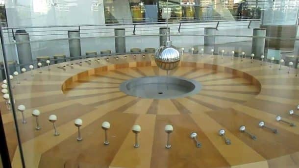 如果你让福柯钟摆摆动的时间足够长,一个小时后,它似乎会改变方向。福柯在1851年首次证明了这个实验;一个61磅重的重物挂在一根200英尺长的铁丝上。当钟摆摆动时,它底部的一个大头针在下面潮湿的沙子上画出了线条。一个小时后,振动的方向发生了变化,大头针画出了一条与第一条线相交的新线,大致成11.25度角。尽管人们已经相信地球自转,但这个实验还是在欧洲和北美引起了轰动。