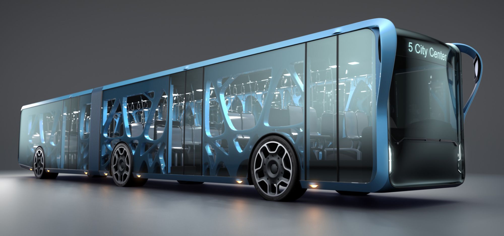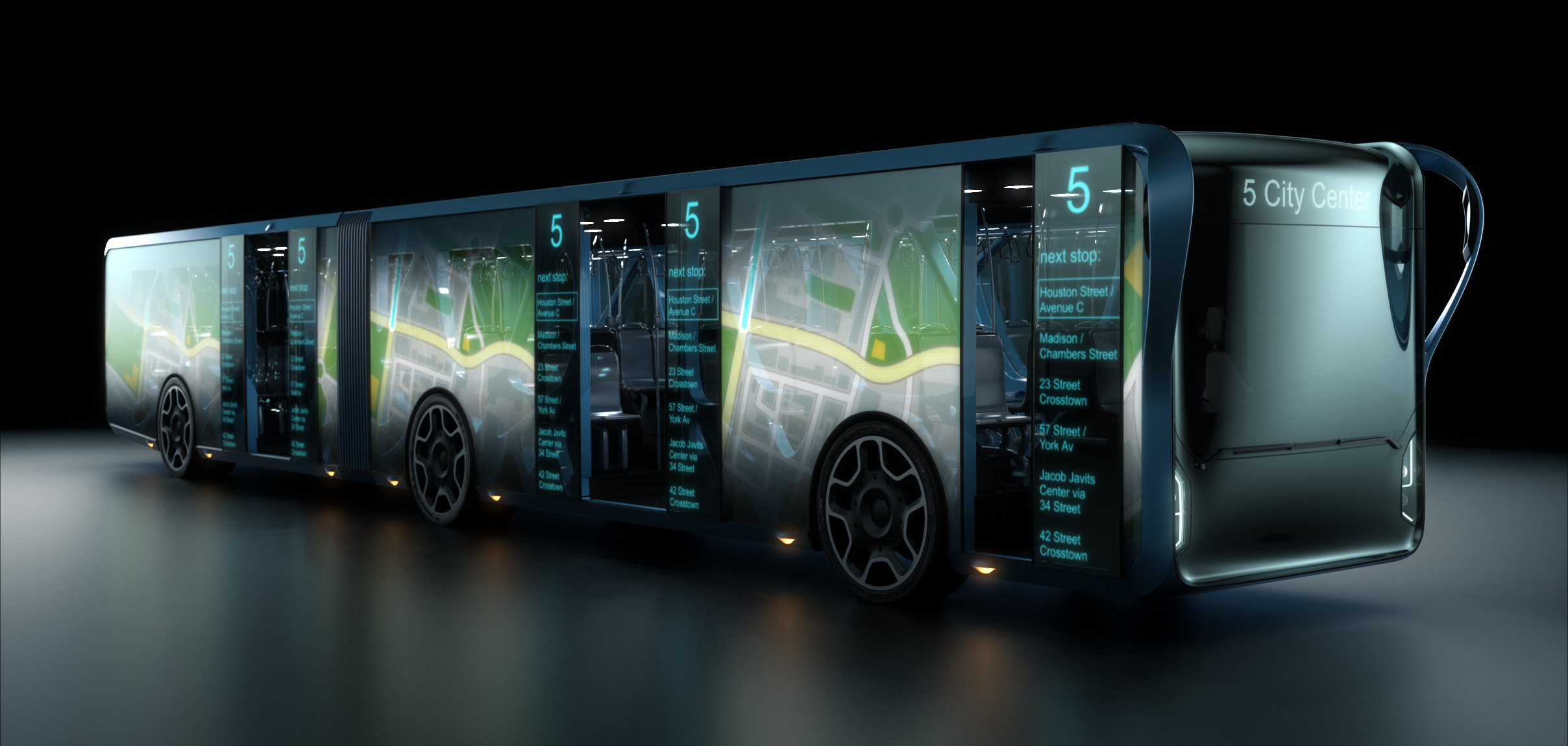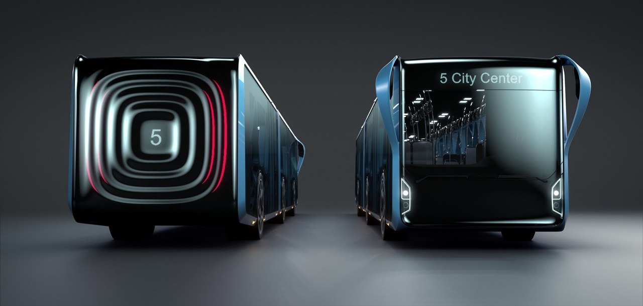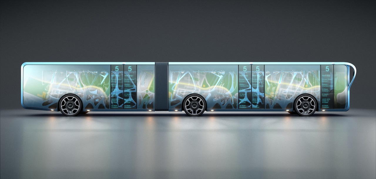 Orlowski的Willie Design专注于作为“画布”可用的大空间。透明的LCD将接管而不是常规的车身面板,并将安装在下面的有机骨骼结构上。得益于屏幕的透明度,乘客仍然能够在外部视图。我们的设计师说,他希望公交时间表,路线信息,电影预告片,天气更新和广告将在屏幕上显示,这些显示器将定期更新,以根据需要提供不同的信息集。