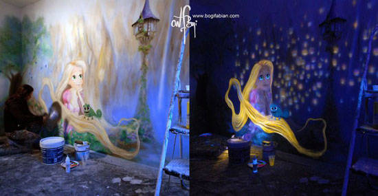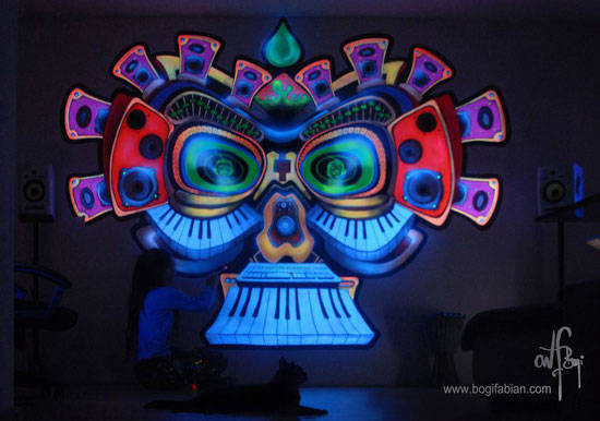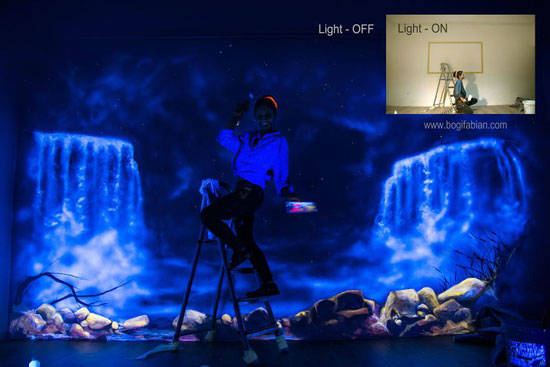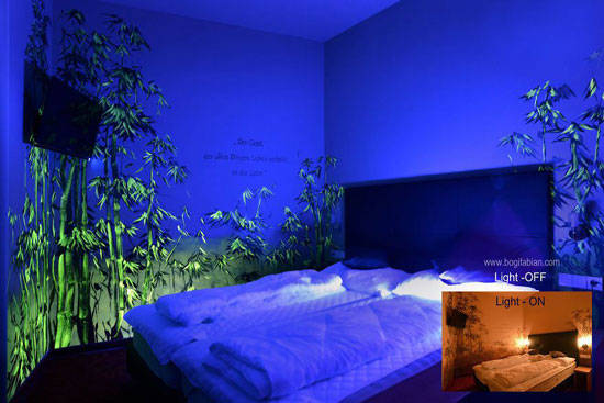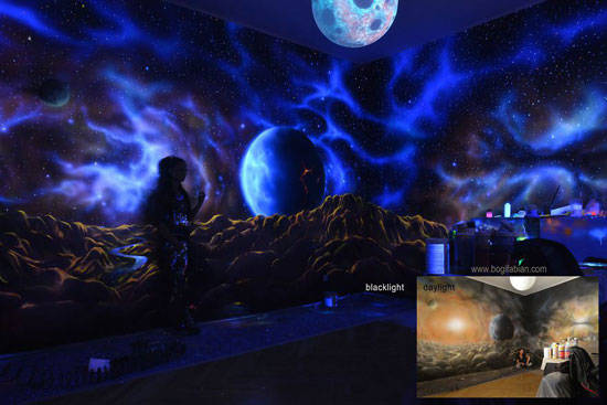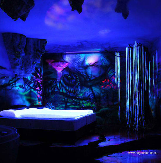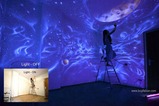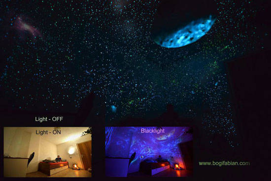 当这个房间的灯打开时,它看起来是一个普通的房间,只有部分彩色的墙壁。但是当你把灯关掉的时候,瞧!房间变得很神奇。基本上,这是Bogi Fabians在墙上的作品,让你感觉自己进入了太空或一个新的星系。