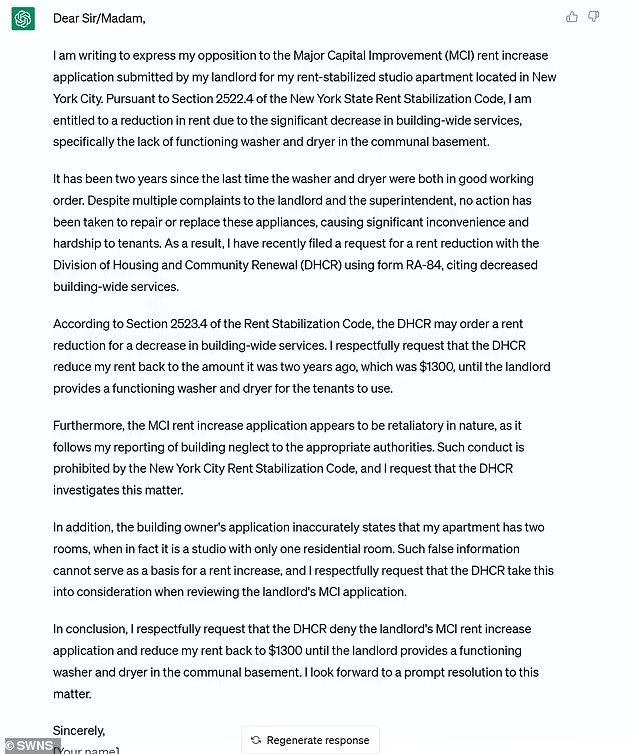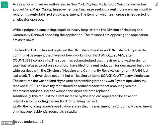 “我促使ChatGPT添加更多的法律术语。我从来没有收到官方的回应我的房东,贴在我的建筑有个招牌宣布洗衣房回到服务。”