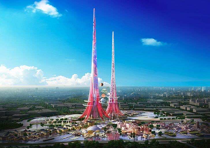 武汉的建议是,中国中部的地方larger tower will reach a height of 3,280 ft and shall house a plethora of sustainable technology. The towers cover a total of 17 acres on ground in a 116 acres plot that is located on an island in a lake. The design incorporates the mythological phoenix bird and the larger tower is the male tower (Feng), while the female tower (Huang) is the smaller tower. The towers are collectively known as Fenghuang (or Chinese Phoenix).