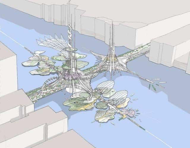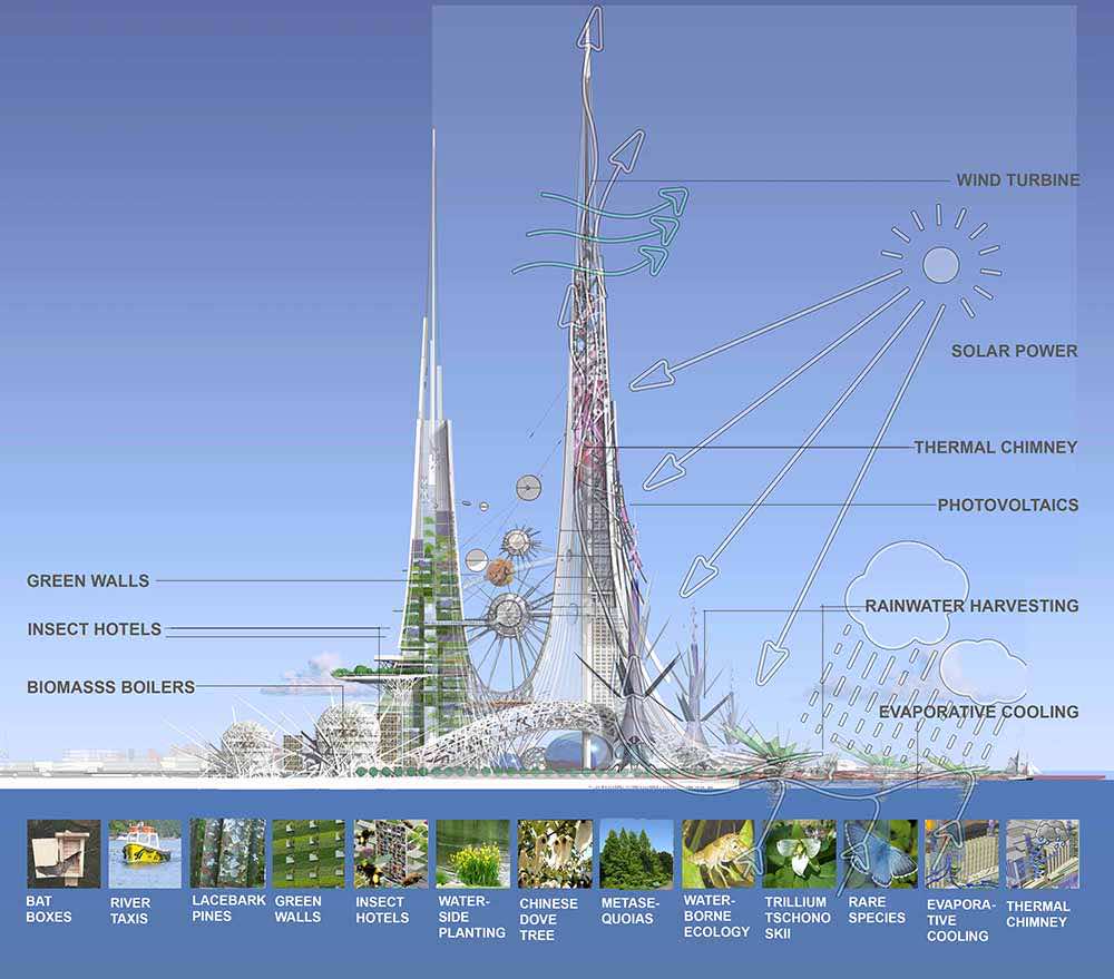 As per the plan; the top of each tower will sport a number of green technologies that includes lightweight photovoltaic cladding, biodynamic pollution-absorbing coatings, thermal chimneys, wind turbines, water harvesting and recycling, waste recycling, and hydrogen fuel cells.