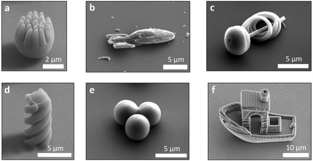 除3DBenchy船外,该团队还创建了螺旋,尖刺的球,螺旋和三个球体组的微武器。物体的一张脸涂有铂金,通过产生气泡来响应周围的介质,向前推动微小的形状。