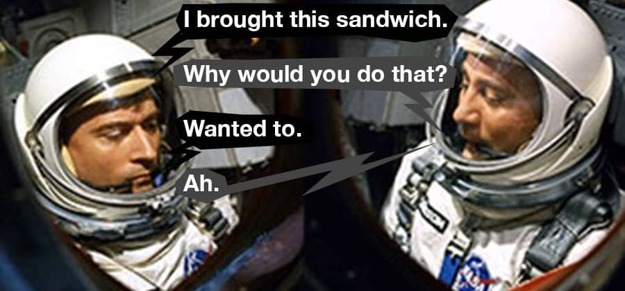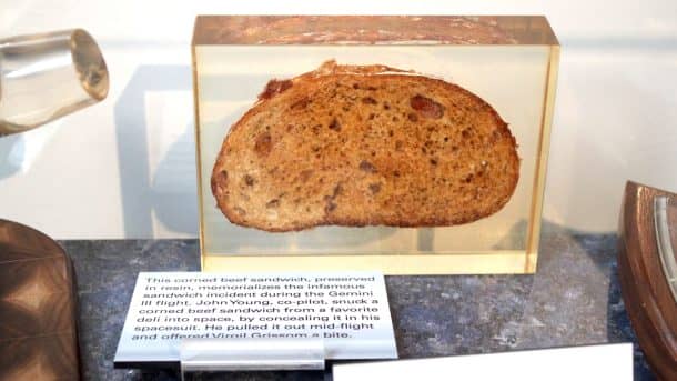 宇航员决定偷偷咸牛肉三明治双子座3飞船在1965年。真的没有什么毛病为宇航员吃咸牛肉三明治,但是当你在空间,这不是很简单。宇航员约翰·杨把三明治放在口袋里藏在他的宇航服和走私。主任空勤人员操作计划在他的自传中写道,他,事实上,允许年轻的三明治。