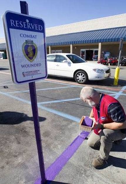 经验丰富的鲍比·伍迪(Bobby Woody)走出当地的洛(Lowe)的家居装修商店,看到了他立即停下的东西。放置在一个位置的紫色标志,表明该点仅保留给受伤的战士。简单的手势足以融化他的心。