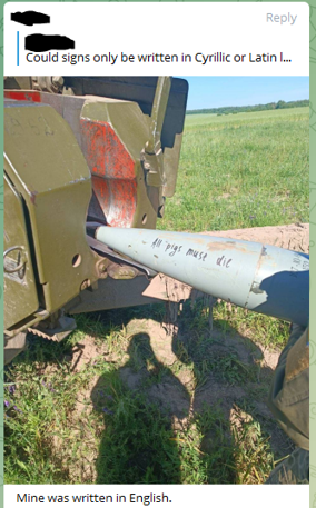 电报邮报说:“前面的士兵将在152毫米炮弹的整个侧面写下您的文字。”“然后向俄罗斯人开火。您可以要求写任何文字:祝某人生日快乐,痛苦,婚姻,姓名,Instagram/ Telegram用户名。”