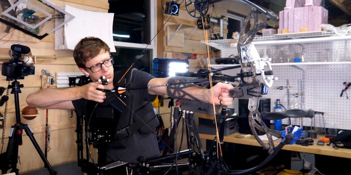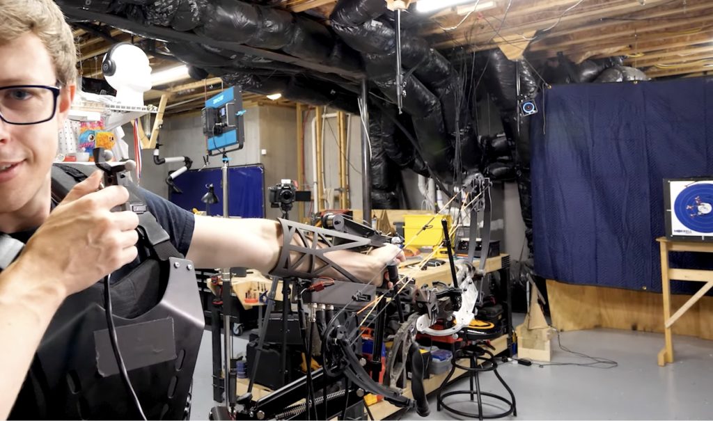 威顿目前的发明是一种重新制作的弓,可以让他拉回弦,让绑在他躯干上的弓装置来处理剩下的部分。可跟踪的传感器和代码确保自动定位系统指向目标。当弓完全对齐时,弦就会出来。