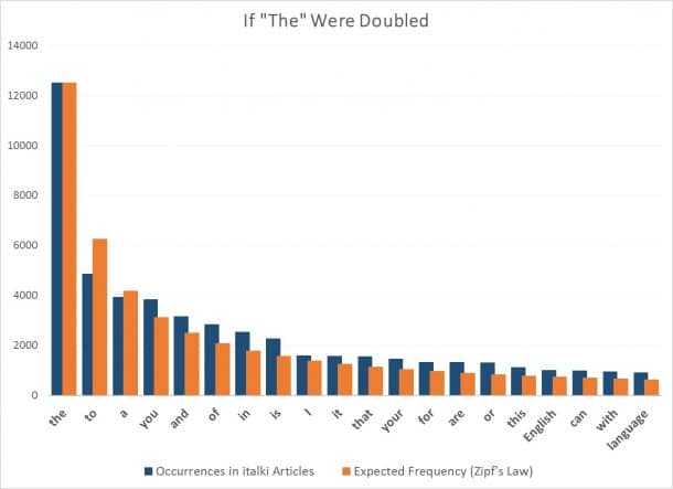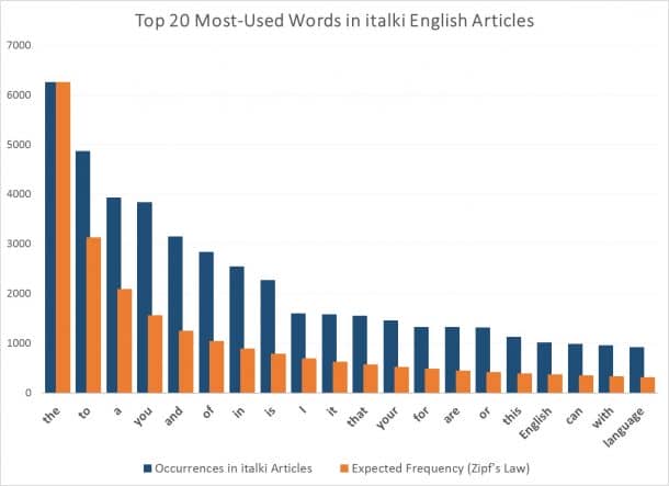 Italki Zipf定律演示使用140的英语学习的文章。收集所有140篇文章变成一个大文档时,他们选择了最发生的20字根据Zipf定律作出预测。下面的图显示了不同的现实和预测是多少