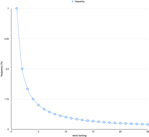 无论英语文本,最常出现的单词,,,,,,,,,和那有很多其他单词在文本中并不经常发生。连接所有这些Zipf频率表展示了曲线的定律。根据牛津大学研究,这些词占25%的所有文本。