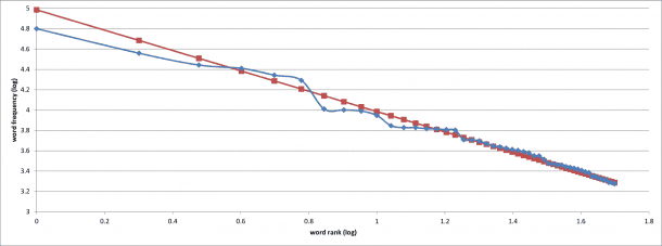 很多事情必须破解你的思想,但Zipf定律是更高的一步。如果你选择任何文本的法律规定,任何词的频率成反比频率表中的排名。所以,出现频率最高的词将两倍的第二高的发生。是这样的: